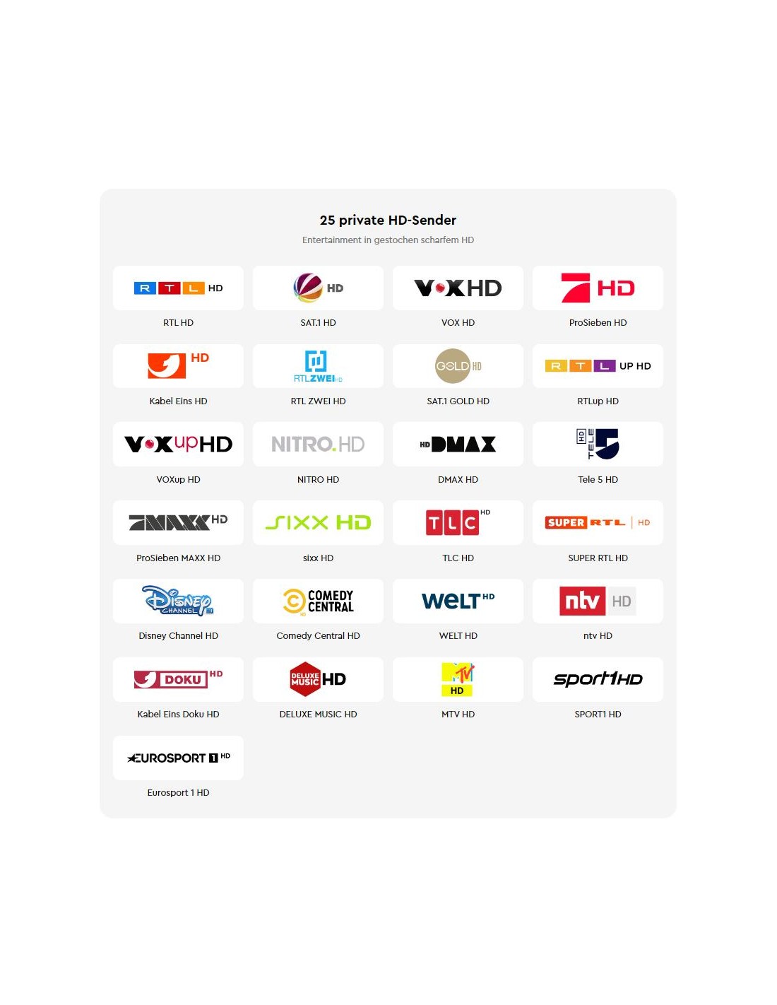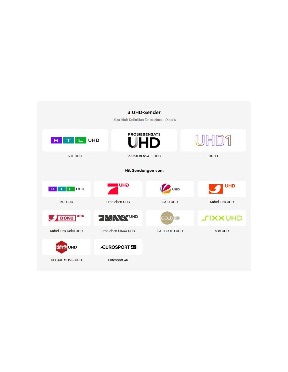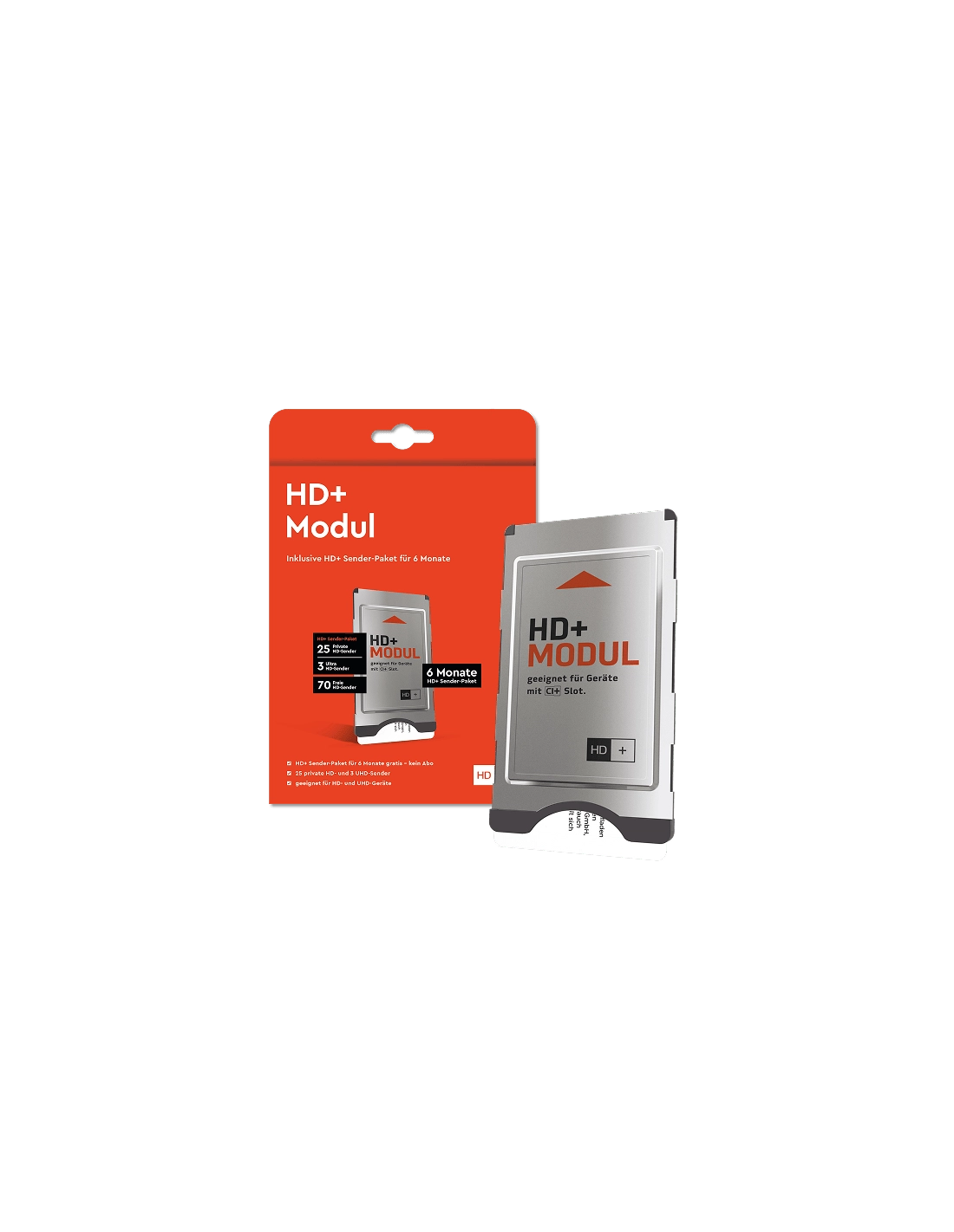 CAM CI Plus que permite acceder a los contenidos de los canales en HD y UHD-4K de la plataforma HD+ en Astra. Incluye suscripción a 25 canales en HD y 3 canales en 4K UHD, como RTL HD, Sat1 HD, ProSieben HD, Kabel eins HD, Vox HD, Sport 1 HD, TravelXP 4K, UHD1, RTL UHD, etc.