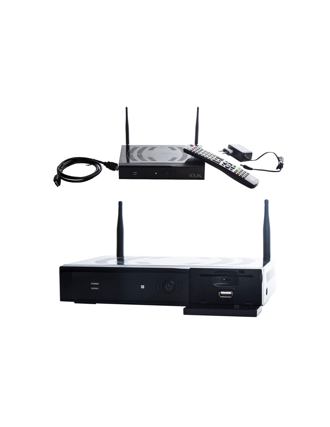 ¿Qué incluye la caja?Incluye el receptor Viark Dual, mando a distancia, 2 pilas AAA, cable HDMI, fuente de alimentación externa, 2 antenas WiFi y manual de usuario en varios idiomas.